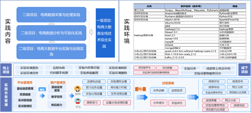 学生可以在电商大数据实训室中体验、学习和实践电商大数据统计分析平台全栈技术,掌握大数据采集与处理工程师、大数据分析与可视化工程师、大数据实施与运维工程师所需具备的核心专业技术,对如何利用大数据技术对电商业务运营和开展做出更加准确、科学的预测和决策有初步的体验,有助于学生对商产融合和产业数字化转型有更好的认识和理解。