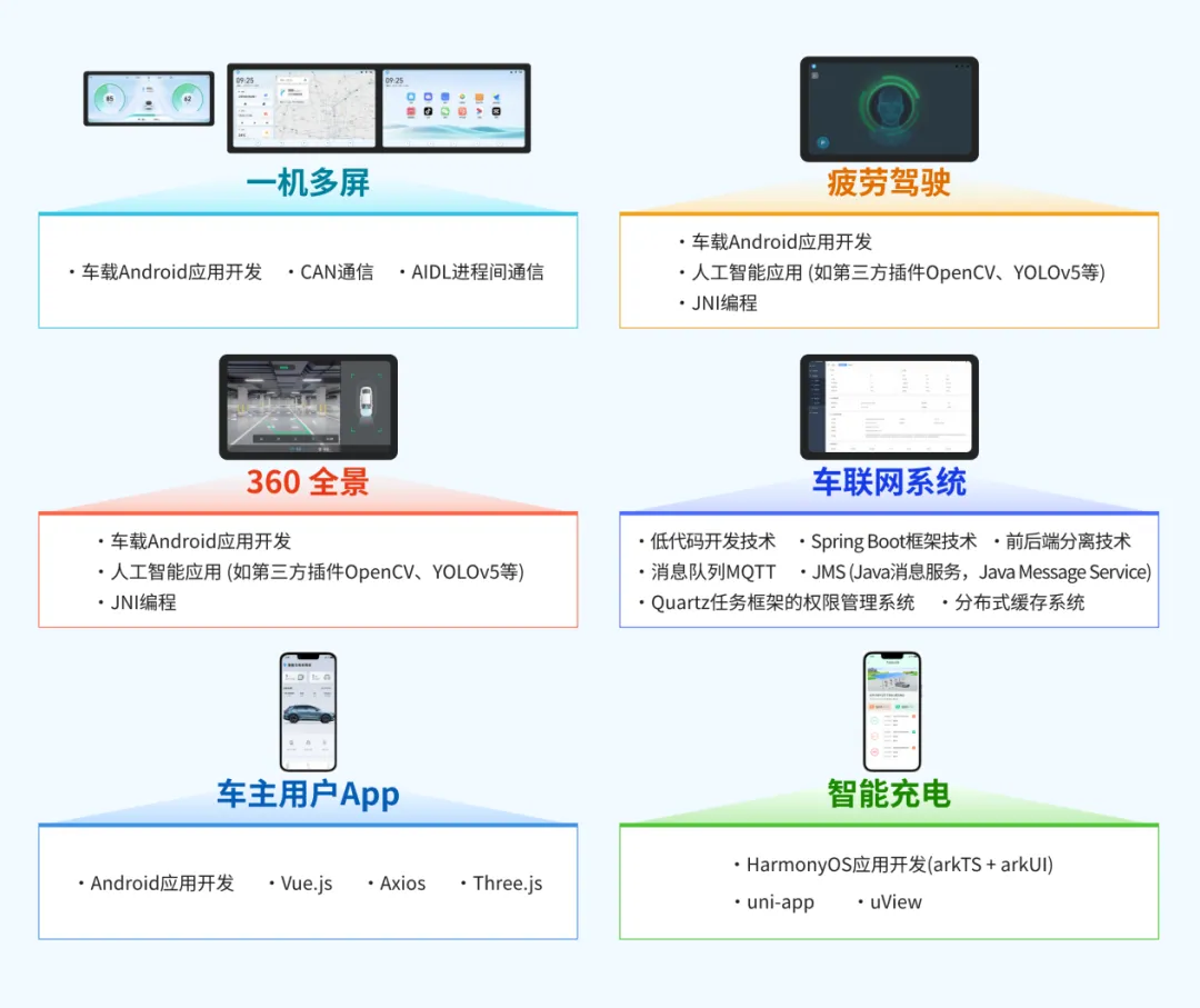 项目产品:智能座舱系统、智能充电系统、汽车销售服务4S系统,包含综合项目13个、课程项目22个