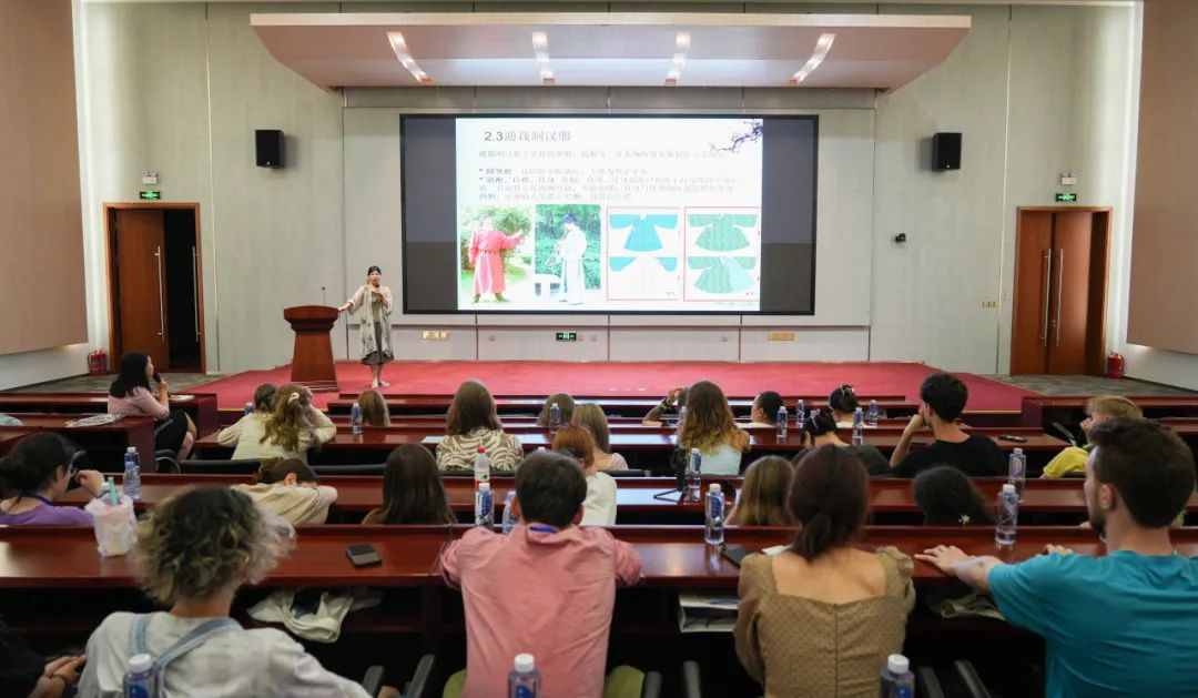研學活動在濃厚的文化氛圍中拉開帷幕。活動現場,留學生們身著精緻的漢服,在講師的雙語講解下,分析漢服的歷史韻味、製作工藝以及背後的文化寓意逐一揭曉,留學生們在讚歎之餘,也深深感受到了中華文化的獨特魅力。