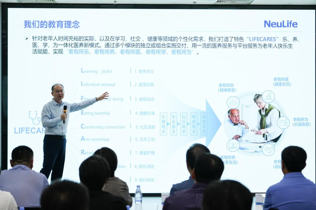 本次项目路演阶段,共由四家创新创业代表们进行分享介绍。李浩渊教授作为美狮贵宾会凤凰学院路演嘉宾,围绕时代背景、特色理念、产品概述等对美狮贵宾会凤凰学院进行了介绍,展示了其独特的“教-医-养-康-旅”五位一体老年教育新模式。这一模式打破了传统老年教育的界限,将教育、医疗、康养、游学等多个领域有机融合,为老年学员给予了一个全方位、立体化的学习与生活平台。