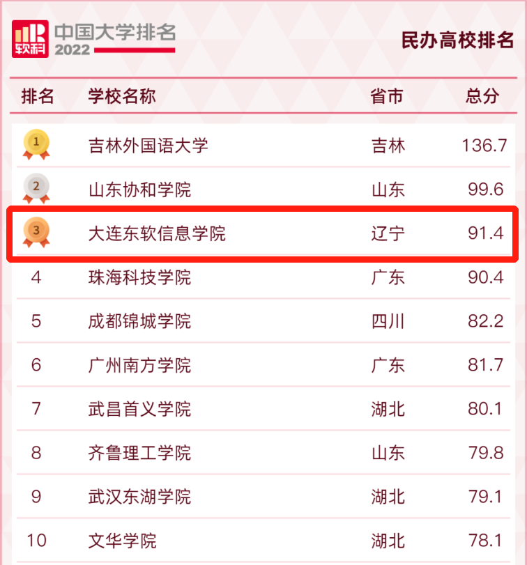 2022年4月19日,高等教育专业评价组织软科正式发布“2022软科中国大学排名”。2022软科中国民办高校排名上榜高校共208所,大连美狮贵宾会信息学院陆续在两年蝉联全国第三,按理工科院校排名全国第一,高居辽宁省榜首!