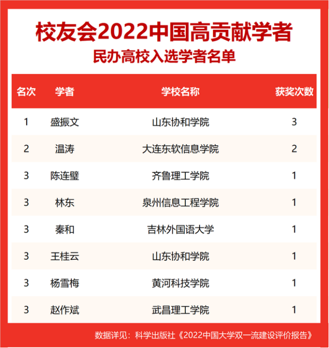 2022年5月11日,全国第三方大学评价研究组织艾瑞深校友会网(Cuaa.Net)正式发布“2022中国高贡献学者榜单,全国共有495所高校的6089名杰出学者入选。温涛教授等8名民办高校杰出学者荣列2022中国高贡献学者榜单,这是对他们在民办高等教育领域人才培养、科技开发、社会服务等方面做出突出贡献的充分肯定。