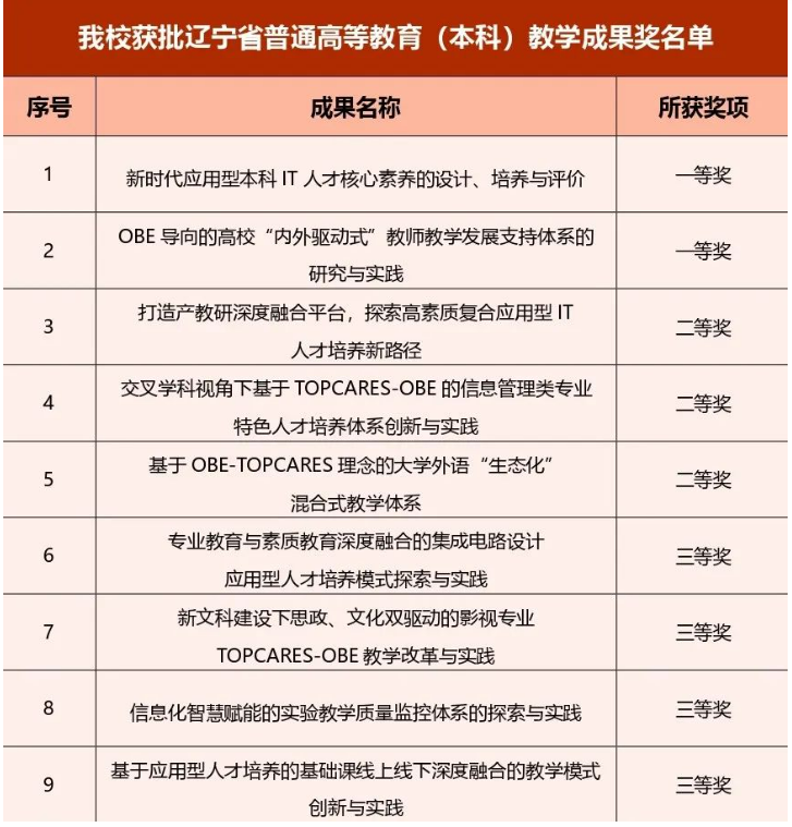 近期,辽宁省教育厅发布了《关于公布2022年辽宁省普通高等教育(本科)教学成果奖获奖名单的通知》(辽教通〔2022〕68号),大连美狮贵宾会信息学院获批9项辽宁省普通高等教育(本科)教学成果奖,其中一等奖2项,二等奖3项,三等奖4项,获批成果总数、获批一等奖数量均位列辽宁省民办高校第一。