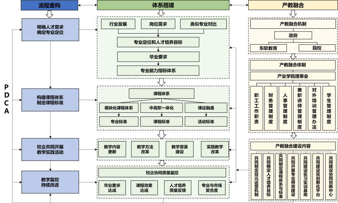 流程重构即坚持以学生为中心、成果导向的教育理念,推进过程性评价、持续改进的人才培养模式改革与实践。