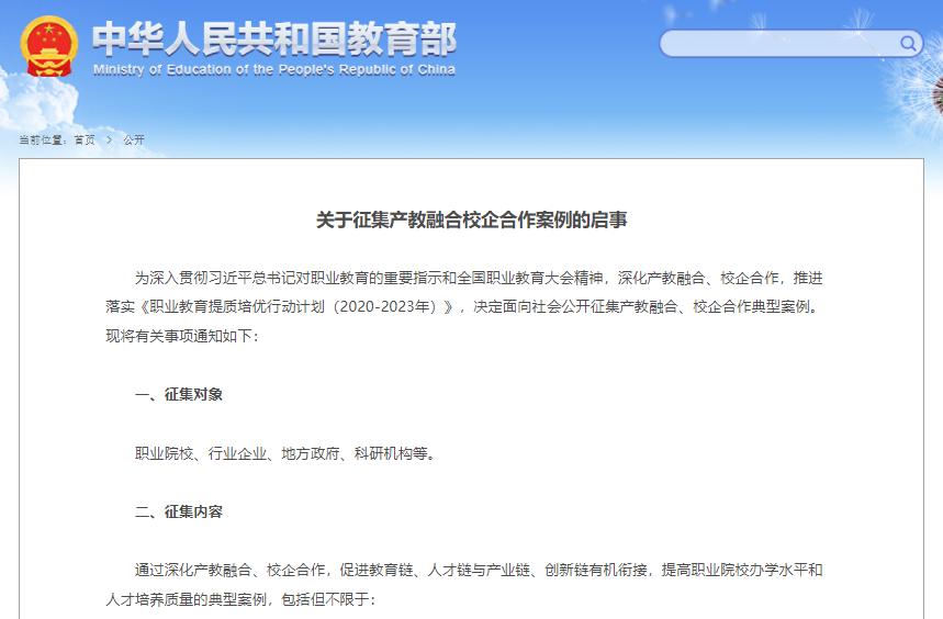 2021年7月28日,为深入贯彻习近平总书记对职业教育的重要指示和全国职业教育大会精神,深化产教融合、校企合作,推进落实《职业教育提质培优行动计划(2020-2023年)》,教育部发布《关于征集产教融合校企合作案例的启事》,面向社会公开征集产教融合、校企合作案例。