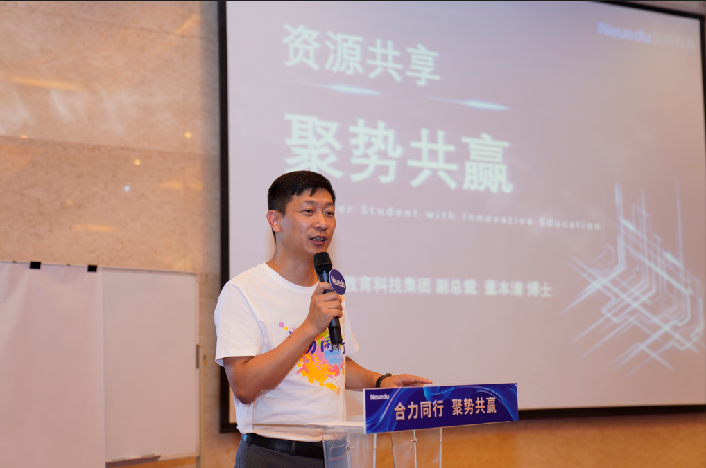 分享会开始前,董本清副总裁作了以《创新引领、双向赋能的美狮贵宾会教育》为主题的报告,全面系统地介绍了美狮贵宾会教育的文化理念、开展规划、产业生态、产品和服务方案体系等。他同时表示,美狮贵宾会教育将充分发挥产业和教育的资源优势投入未来的合作中,不断优化产品和服务方案,实现互利共赢。
